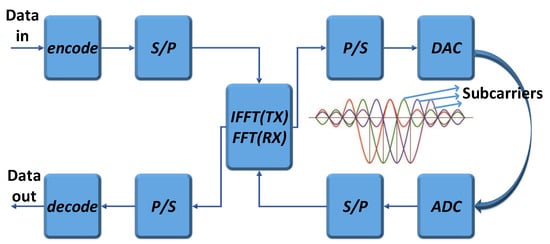 The working process of the OFDM system is shown in Figure 1. At the OFDM transmitter, the serial input data are converted into N parallel data and assigned to N different subcarriers. These data are passed through the channel in a serial manner by the inverse fast Fourier transform (IFFT) and parallel/serial (P/S) conversion. After the digital-to-analog converter (DAC) and low-pass filter, the OFDM signals are finally output. The reception process of OFDM signals is the inverse of the transmitting process. The received signals are converted into the frequency domain after the fast Fourier transform (FFT) and, finally, recovered to binary data at the transmitter after P/S conversion and decoding.