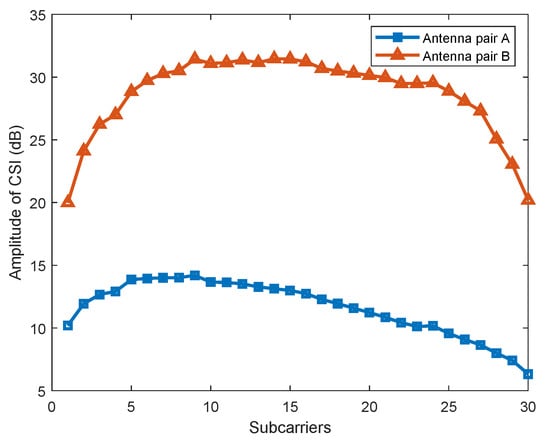 Unlike AmpFi, FuFi focuses on the differences in the same subcarrier between multiple antennas in the MIMO system. The Linux 802.11n CSI Tool was used to collect the CSI, which was based on the Intel WiFi Wireless Link 5300 802.11n MIMO radios and can read 30 subcarriers. From the data collected, we found that the CSI amplitudes differed considerably between multiple antenna pairs for the same subcarrier. As shown in Figure 3, the amplitude of Antenna A was between 5 dB and 15 dB, while that of Antenna B was between 20 dB and 33 dB; the subcarriers’ amplitudes of Antenna Pair A and Antenna Pair B were very different, so it was not reasonable to average the values of multiple antenna pairs when calculating the amplitudes of the subcarriers. Therefore, FuFi treated the subcarriers of all antenna pairs as independent features, which can fully utilize the full-dimensional CSI of the MIMO system to improve the localization accuracy.
