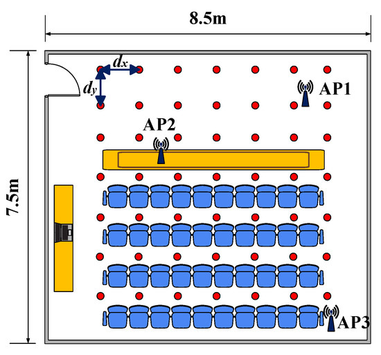 First, a 8.5 m × 7.5 m conference room was used as the experimental site. Three APs were deployed at the specific locations in the conference room, which is shown in Figure 5. Both and were equal to 1 m. In the offline phase, the CSI was collected from 49 reference points to construct a fingerprint database. The data were collected 1000 times per location to improve the accuracy of the data. The sampling interval was set to 0.01 s.