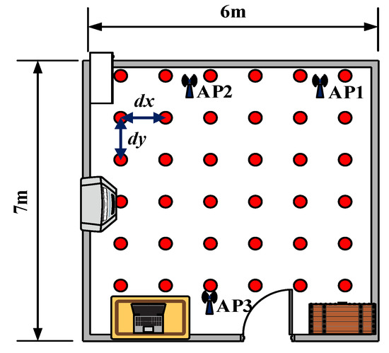Second, the experiment was conducted in a living room, which was 6 m × 7 m and also covered by three APs. In this scenario, and were set to 0.9 m. The fingerprint was collected at 36 different reference points as shown in Figure 6. The data were collected 500 times per location, and the sampling interval was set to 0.01 s.