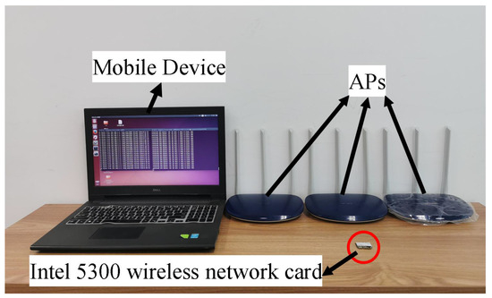The experimental system is shown in Figure 7, which consisted of a Dell laptop equipped with an Intel 5300 wireless network card as the mobile device and three TL-WR886N routers, which work at a bandwidth of 20 MHZ, as the APs. In our experiments, each AP used two transmitting antennas, and the mobile device used three receiving antennas. In order to reduce the error, the user was asked to stand at different locations using the same posture.