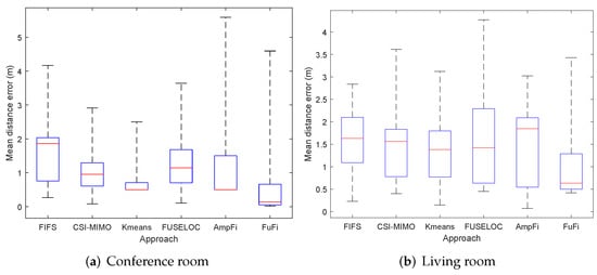 To further show the distribution of the distance errors for each localization method, we plot the respective box plots for the experimental results. Figure 10a shows the box plot in the conference room. It can be found that the upper quartile, median, and lower quartile of the distance error of FuFi were the smallest. It can be concluded that FuFi’s ability to locate most of the test points was better than several other methods. The box plot of the experiment in the living room is shown in Figure 10b; similarly, it can be found that FuFi still has the smallest upper, median, and lower quartiles of the distance error. Therefore, we can conclude that FuFi is the best-performing localization approach.
