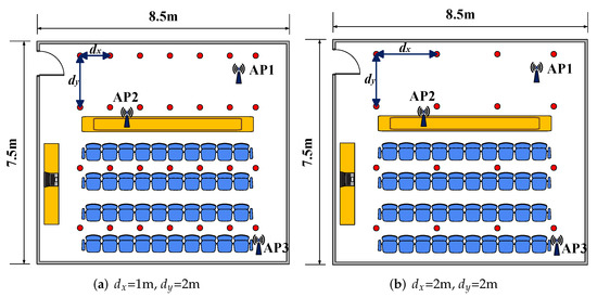 In addition, the effect of the number of reference points on the localization performance was explored in the same experimental region. In the conference room, the number of reference points in the region was modified to 28 and 16. Correspondingly, was set as 1 m, 2 m, and was set as 2 m, 2 m, respectively. The layout of the reference points is shown in Figure 11.