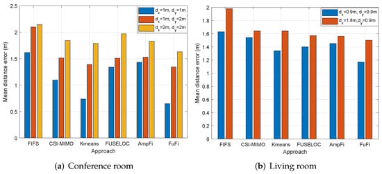 The results of the experiment conducted in the conference room are shown in Figure 8a. We can find that FuFi, which uses full-dimensional CSI information, had the smallest MDE, i.e., 0.65 m. The MDEs of FIFS, CSI-MIMO, K-means, FUSELOC, and AmpFi were 1.62 m, 1.10 m, 0.74 m, 1.34 m, and 1.43 m, and the gains of FuFi compared to them were 59.9%, 40.9%, 13.8%, 51.5%, and 54.5%, respectively. The results showed that the performance of FuFi was significantly better than the other fingerprinting-based localization approaches. To improve the credibility of our conclusion, the experiment was repeated with an AP in the living room. The experimental results are shown in Figure 8b, where we can also find that FuFi outperformed the other approaches. In the living room, the gains of FuFi compared to FIFS, CSI-MIMO, K-means, FUSELOC, and AmpFi were 28.2%, 24%, 13.3%, 16.4%, and 19.3%, respectively. The gains were reduced, and we speculated that the cause may be the more complex environment in the living room and interference from other wireless signals. In this scenario, the accuracy of all localization approaches decreased, but the performance of FuFi was still the best.