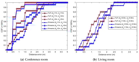 After that, our conclusions were verified using the CDF of the distance error. FuFi was selected to compare with the previously most-prominent approach K-means, and the experimental results in the conference room and living room are presented in Figure 14a,b, respectively. Similarly, FuFi outperformed K-means, and their performances deteriorated as the number of reference points decreased.