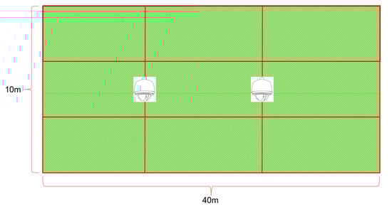This study was conducted in the small town of Xertala, Inner Mongolia (longitude: 120.00435, latitude: 49.34809), from 22 August 2022 to 19 September 2022. The data collection experiment was carried out in a 40 m × 10 m experimental grassland area, as shown in Figure 1. The experimental grassland was divided into three 40 m × 3.3 m experimental areas, each equipped with natural grass and drinking basins, where the sheep were free to feed and drink during the experiment. In natural grasslands, the primary grass species was sheep grass. To mitigate any detrimental effects of excessively tall grass on sheep behavior, the grass was routinely trimmed to a height of approximately 8 cm.