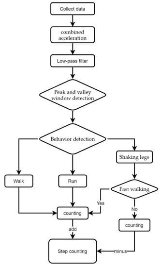 Figure 3 shows this paper’s flow chart of the step-counting algorithm. The final total step count = peak count − running behavior window peak count + running steps − leg shaking steps. It should be noted that when calculating the total number of steps, the peak count includes the inaccurate data of running as well as leg shaking behaviors, so when calculating the number of steps of running behaviors, the resulting inaccurate steps need to be subtracted from the number of steps calculated by the peak and valley values.