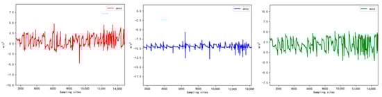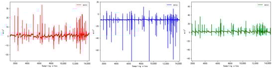 Due to the high sensitivity of the motion sensor, it tended to capture subtle noise fluctuations generated by sheep movement during walking. To address this issue, the collected raw data needed to be filtered. Figure 4 illustrates the waveform of the raw data obtained from the device’s three-axis acceleration readings. The noise fluctuations present in the data primarily consisted of high-frequency signals. To mitigate this noise, a low-pass filtering technique was employed [15]. The results of this filtering process are presented in Figure 5.