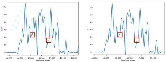 Equation (2) also allows for detecting valley values within the data. The choice of the n value in the formula affects peak and valley values detection. If n is too large, some valid values may be incorrectly identified as anomalous. Conversely, if n is too small, some anomalous pseudo-wave peaks may be overlooked. After comparing data, it is determined that setting n to 4 is a reasonable choice for detecting peak data. Additionally, since peak and valley data always appear in pairs, valley data can effectively be detected with an n value of 2. The final detection result is presented in Figure 7, where the detection window successfully captured the peaks and valleys of the acceleration data while eliminating some pseudo-peaks between them. The peak detection method can calculate the steps for slow and fast walking behaviors. Specifically, when the peak value (accp) reached the threshold condition of thr = 12, it was considered that the sheep completed a regular walk.