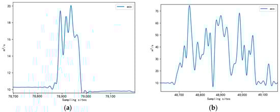 During sheep walking, the raw data collected by the wearable device exhibited a certain periodicity in the waveform after data processing. Leveraging this characteristic, the number of steps can be calculated using the peak detection method [20,21,22]. A peak detection window with a window size of n was established to eliminate the interference of abnormal pseudo-peaks on step counting. This was carried out by considering n data points to the left and right of the waveform, as described in Equation (2). Here, acci represents the acceleration value at the current moment, and A and B values are used for determining wave peaks.