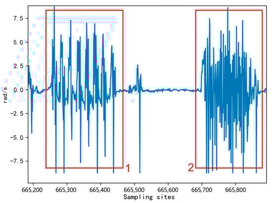 We analyze the acquired data for each axis of the six-axis sensor. As a result, we found more apparent features in the X-axis angular velocity that distinguish two behaviors, as shown in Figure 11, where marker 1 was the fast-walking behavior waveform and marker 2 was the leg-shaking behavior waveform.