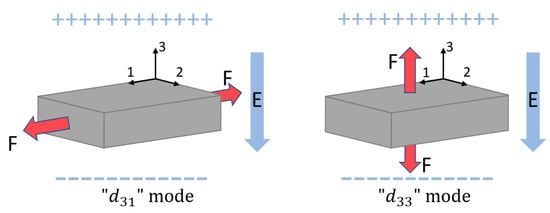 Generally, piezoelectric materials have two main strain modes, “” mode and “” mode. The first subscript number “3” denotes the poling direction, which is the same as the output voltage direction, while the second number is an indication of the direction of the applied force. As shown in Figure 1, the “” mode means that the force direction is perpendicular to poling voltage direction. In contrast, the force direction is parallel to poling voltage direction in “” mode. For the same piezoelectric material, the “” is usually greater than or equal to two times of “”. More importantly, the mechanical-to-electrical energy conversion efficiency of the “” mode is 3~5 times [62,63] higher than the “” mode. However, the “” mode is more popular than the “” mode in energy harvesting applications because (i) “” mode can be simply applied to cantilever beam-type piezoelectric harvesters, and (ii) “” mode needs more advanced piezoelectric harvester structure configurations, such as flextensional harvesters [14,40,63,64,65,66,67] and multistage amplification harvesters [68,69,70].