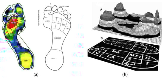 (a) The mask defining the 10 regions of the foot (the pressure from lower to higher: blue → green → yellow → red): left foot, Reprinted with permission from [78]. Copyright © 2023 Elsevier, right foot [79] Reprinted with permission from [79]. Copyright © 2023 Elsevier; (b) foot pressure distribution: (A) maximum pressure distribution, (B) the nine anatomical masks superimposed on the insole (MC = medial calcaneus, LC = lateral calcaneus, MA = medial arch, LA = lateral arch, MT1 = first metatarsal, 3 = second and third metatarsal, 4 = fourth and fifth metatarsal, H = hallux, and T = toes). Reprinted from [74] open resource.