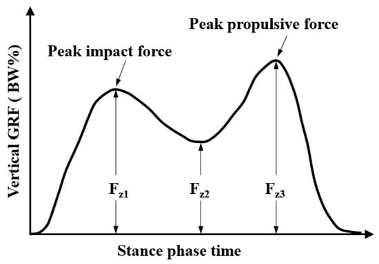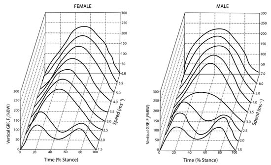 The vertical GRF shows different patterns at various walking and running speeds. The basic pattern of the vertical GRF during human walking has been extensively studied during the first half of the last century, Figure 4 graphically illustrates the typical pattern of the vertical GRF during human waking, which exhibits double peaks with an interjacent trough. The vertical GRF initially rises quickly and then falls, forming the first impact peak Fz1, which is about 1.6 BW at around 15–25% of the stance. The first peak vertical GRF is also referred to as the trust maximum force. It slowly decreases to the minimum Fz2 at the middle of the stance, and then it increases to a second peak which is around 2.5 BW, termed the maximum propulsive force, before decreasing prior to toe-off [92]. The vertical ground reaction force generally has a larger peak during the propulsive phase of the gain cycle (Fz2) than during the impact phase (Fz1). The vertical impact peak force during short-term downhill running is higher than the one during level running [93]. Keller et al. [90] also reported that the vertical GRF increased linearly during walking and running but remained constant at higher speeds. The vertical GRF–time histories only consisted of a single peak located at about 40–50% of the total stance time at higher running speeds for both female and male subjects, as shown in Figure 5, which is quite different from the double-peak pattern during walking. The mean vertical GRF ranged from 1.2 BW at 1.5 m/s to 2.5 BW. The greatest vertical GRF was found in the range of 2.5–3.0 m/s, which was recognized as the speed transition region between walking and running, and there were no significant increases observed at a speed over 3.5 m/s.