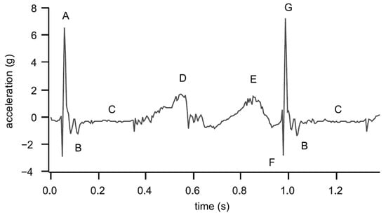 The acceleration measured at the calcaneus for one gait cycle: (A) previous heel strike, (B) oscillation after heel strike, (C) baseline, (D) heel strike of the opposite limb, (E) swing phase, (F) downward acceleration at heel strike and (G) upward acceleration at heel strike [95]. Reprinted with permission from [95]. Copyright © 2023 Elsevier.