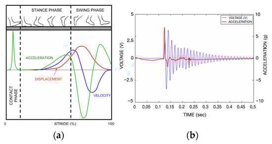 (a) qualitative relation between the acceleration at the heel and walking stance; (b) measured acceleration at the heel and voltage output of the piezoelectric energy harvester [13]. Reprinted with permission from [13]. Copyright © 2023 IOP.