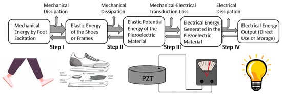 Energy flow chart of piezoelectric footwear energy harvesters [42,99,100,101,102,103]. Reprinted with permission from [103]. Copyright © 2023 IEEE.