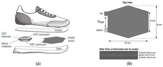 (a) Two approaches: a PVDF stave under the ball of the foot and a PZT dimorph under the heel [103] Reprinted with permission from [103]. Copyright © 2023 IEEE.; (b) layout of the PVDF stave [120]. Reprinted with permission from [120]. Copyright © 2023 IEEE.