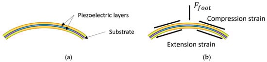 The curved structure intensifies the strain of the piezoelectric films when the force from the foot is applied on it. Based on our further understanding the mechanism of the references [102,111], Figure 12b shows the force transmitted in the curved structure. Assuming the force from the foot is , when the curved energy harvester is pushed down, the piezoelectric sheets on the up surface of the core substrate will contract, while those below the substrate will expand. The stretch/compression force of the piezoelectric films is amplified by the curved structure so that there will be more power output compared to the flat plate structures.
