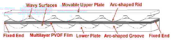 To generate a high output power from the piezoelectric generator for wearable applications, Jung et al. [105] demonstrated a curved fusiform structure. The structure diagram is shown in Figure 14b. The structure consisted of two curved piezoelectric generators connected on the edges. Each of them comprised a curved plastic core substrate and two PVDFs attached on each side of the substrate surface. The gold layers served as electrodes. When the generator was attached on the insole, during 0.5 Hz frequency walking, around 25 Volts of average voltage and about 20 µA of average current were obtained. An alternative way of the curved type is to make multilayer piezoelectric films sandwiched between two wavy surfaces, as shown in Figure 15 [106]. The wavy shape structure was specially designed to enable the PFDV films to obtain a large longitudinal deformation, as well as to reduce the harvester’s thickness for the shoes’ limited inner space. An average output power of 1 mW was harvested during a walk at a frequency of 1 Hz.