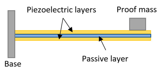 The structure of the cantilever piezoelectric energy harvester is relatively simple. As shown in Figure 16, the beam is composed of two layers of piezoelectric films, with the left end fixed on a base and the right end free. The configuration is known as “unimorph” if there is only one piezoelectric layer bonded to the metallic layer, and “bimorph” if there are two piezoelectric layers [12]. Usually, there is a proof mass on the free end to lower the resonance frequency of the harvester. It would produce a damped oscillation when the free end is stressed [130]. It has been found that the power output and the resonance frequency of a cantilever energy harvester is tuned by the proof mass [64,131]. More importantly, the fundamental bending mode of a cantilever is significantly lower than the other vibration modes of the piezoelectric element. Therefore, it is suitable for low-frequency conditions for low self-vibration frequency [132], such as in walking and running. The power output of this structure relies on the beam materials, the shape of the beam, the weight of the mass, driving frequency, etc. [133,134,135,136]. Hence, appropriate mechanical and electrical optimizations are necessary.