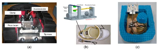 - Cha, Y.; Seo, J. Energy Harvesting from a Piezoelectric Slipper during Walking. J. Intell. Mater. Syst. Struct. 2018, 29, 1456–1463. [Google Scholar] [CrossRef]