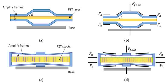 The force-amplifying structures can be used to increase the power output of the flextensional energy harvester. The frames of the structure serve as a mechanical transformer with a force amplification effect to transfer the compressive load force into tensile force along the horizontal direction. The free-body diagrams of the cymbal structure and stacked flextensional structure are illustrated in Figure 18b,d. The overall horizontal force 2 of the piezoelectric material can be approximately expressed by
