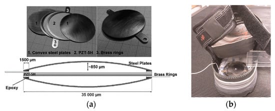 - Kim, H.; Priya, S.; Uchino, K. Modeling of Piezoelectric Energy Harvesting Using Cymbal Transducers. Jpn. J. Appl. Phys. 2006, 45, 5836. [Google Scholar] [CrossRef]
