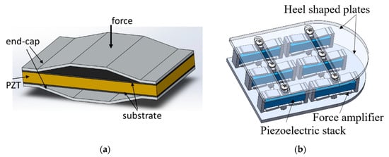 Various piezoelectric footwear power generators have been developed over the past two decades to convert mechanical energy under the foot to usable electricity. To fit in the limited space between the foot and the ground, the structures of piezoelectric transducers were designed diversely. A majority of the designs are for directly harvesting the plantar foot pressure and ground reaction forces, such as the piezoelectric insole and sole energy harvesters [109,110,111]. Because shoe soles bend during walking, the insole and sole piezoelectric energy harvesters are usually designed with flexible structures and soft piezoelectric materials, such as PVDF. Stiffer structures could lead to discomfort and invasiveness, or even changes the gait pattern during human walking. The locations of piezoelectric transducers inside shoes mainly depend on the energy sources targeted to harvest. While insole harvesters are designed to harvest foot pressure, piezoelectric stacks and thunders are particularly favored for scavenging ground reaction forces and are therefore usually placed in the heel and forefoot [13,14,16,112]. To improve the power generation performance, piezoelectric transducers with force amplifiers are developed to amplify the ground reaction force. Transducers for harvesting large ground reaction forces and pressure under the foot need capacity and durability to withstand the repetitive impact forces to prevent early fatigue failure. Generally, the structures of piezoelectric transducers for foot wearable energy harvesters in the literature have been categorized into four types: flat plate, curved shape, cantilever, and flextensional design. Piezoelectric cantilever harvesters are more suitable for harvesting the acceleration generated by either the heel strike or leg swing. The positions where piezoelectric transducers are implanted vary from heel, insole to the sole. This section discusses the state-of-the-art research on piezoelectric footwear energy harvesters in terms of their structures and locations.