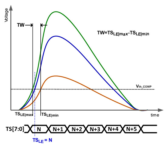 Time resolution is determined by the accuracy with which the time of arrival (ToA) is measured. The ToA is defined as the time in which the signal induced by the detected particle exceeds a threshold voltage. As particles that deposit different amounts of energy induce signals of different amplitudes and rise times, different ToAs are expected to be measured for particles with different energies, even when they impact at the same instant. This effect, known as time walk (TW), is responsible for determining the time resolution of the whole system. Note that the ToA can only be acquired with the accuracy of the system timestamp (TS), and, consequently, in the literature, the terminology TS of the leading edge (TSLE) is preferred. In practice, accuracies of a few nanoseconds are targeted in HEP. As the sensor reacts in a few hundred picoseconds, the readout electronics is the bottleneck. Figure 1 shows the signal at the output of the charge-sensing amplifier (CSA) for three hits with different amounts of energy. That figure illustrates the definition of TW, which is calculated for a certain energy range as the difference between the stored TSLE of the particles with minimum energy (TSLemin) and maximum energy (TSLemax).