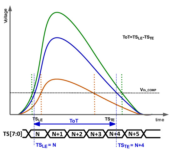 where TSLE and TSTE are given by the moments when the amplified signal surpasses and crosses down the discriminator threshold, respectively. As mentioned above, the TSLE is the stored time corresponding to the ToA. From Figure 2, it is established that the larger the ToT, the higher the energy of the particle.