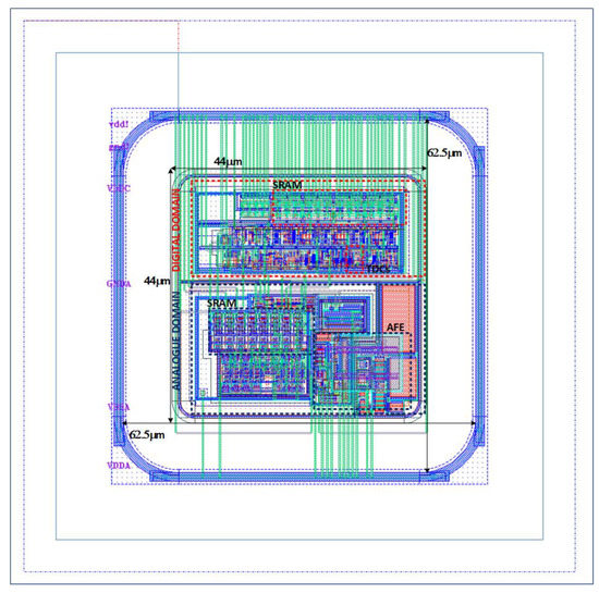 The starting point of this work is the RD50-MPW3 [18], which is a two-column-based matrix of 64 × 64 pixels. Each pixel consists of a 62 µm × 62 µm size sensing diode that integrates both the analog and digital readout electronics in an area of less than 44 µm × 44 µm (Figure 3).