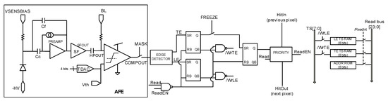 The output of the comparator is processed by the digital readout. This circuitry includes an 8-bit ROM to store the pixel address within the double column and two 8-bit RAMs that store the TS of the leading edge (TSLE) and trailing edge (TSTE). Specifically, an 8-bit gray-encoded TS running at 40 MHz is continuously written in the RAMs. Once a hit event is detected, the last stored TS is held, and the HitOut flag is set, disabling the processing of a new event until the pixel is read. The HitOut flag is also sent to the following pixels. Figure 5 depicts the time diagram of the digital logic described above. Note that the read of the pixel after a hit is based on a priority OR chain.