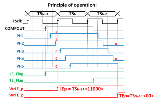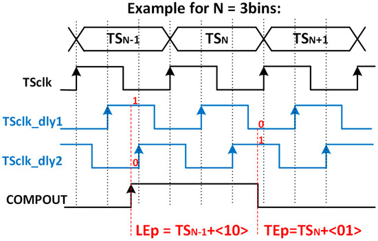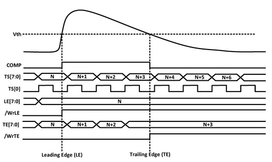 Their principle of operation is shown in Figure 8, where the number of bins is limited to three for simplicity. The VCDL acts as a phase generator, since the output of each stage corresponds to a delayed version of the clock used to generate the TS. When the amplified signal surpasses the discriminator threshold, a leading-edge event occurs, the output of the AFE (COMPOUT) is asserted, and, consequently, the TDCLE is triggered. At that moment, the TS and the VCDL output are stored. Therefore, the leading edge is detected, in this example, at , which corresponds to the second bin of the TSN−1. Similarly, when the amplified signal crosses down the discriminator threshold, a trailing-edge event occurs, and COMPOUT is deasserted. Consequently, the TDCTE is triggered, storing the TS and the output of the VCDL. Thus, the trailing edge is detected, in this example, at . Note that both TDCs do not replace but complement the existing TS registers depicted in the original pixel (Figure 4), now becoming coarse–fine TDCs.
