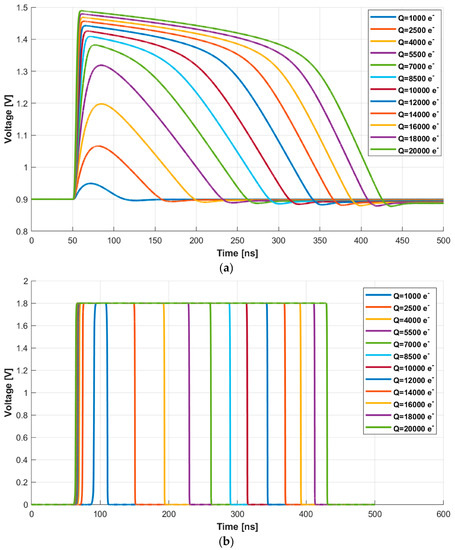 The first block receives, as input, post-layout simulations of the MPW3-RD50 AFE and randomizes the impact time of the energy particles. Specifically, the post-layout simulations are performed for energies in a range from 1000 e− to 20,000 e− with a total number of 70 points uniformly distributed. Figure 9a shows the response of the source follower after the preamplifier (HPOUT in Figure 4), while Figure 9b depicts the output of the comparator (COMPOUT). Note that, for clarification purposes, the figure shows curves spaced in 1500 e− energy steps for impacts below 10,000 e− and 2000 e− steps for the 10,000 e− to 20,000 e− range.