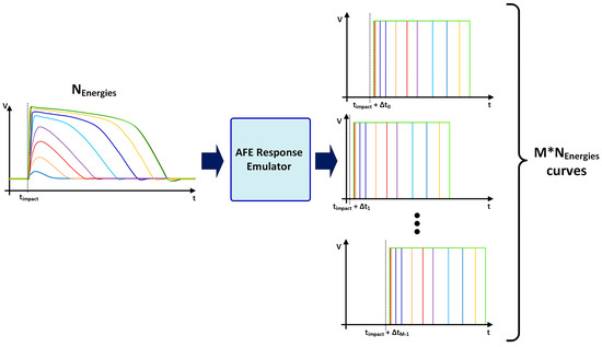 Therefore, this first block is responsible for generating M*Nenergy curves, where Nenergy = 70 represents the number of simulated energy levels and M = 50,000 is the number of simulated impacts with different impact times for the same energy. Note that the impact time of each set of curves is uniformly distributed between t0 and t0 + 2 TSCLK and the total number of curves is then 3,500,000, which constitutes a statistical population that ensures consistent results for the following analysis.
