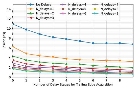 To optimize the number of stages in each TDC (TDCLE and TDCTE), simulations were performed considering up to nine stages for each of the TDCs. Figure 14 shows the average value of ε after correction against the number of stages that compose the TDCTE. Note that each curve represents a different NLE. Additionally, cases where the comparator output is not captured with a TDC converter (NLE = NTE = 0) were included to determine the impact on the error.