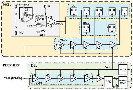 The VCDL generates the five clock phases that must be controlled by a delay-locked loop (DLL) to cope with intrinsic process variability and compensate for ageing and radiation effects [21]. The DLL is fed with the clock used to generate the TS, adjusting the delay of each VCDL element to a sixth part of the clock period and generating six bins of equal size. The most convenient approach seems to be to locate the DLL in the periphery of the matrix, shared by all pixels in a column (Figure 16). This avoids significant dynamic power consumption and helps with the area limitations inside the pixel. The main drawback of this solution is to route five high-frequency clock phases along the pixel column. This implementation would consume significant routing resources, limiting either the minimum size of the pixel or the minimum distance between them and, therefore, the spatial resolution that can be achieved. This complex routing can also jeopardize the signal integrity of the rest of the chip, which is critical, as the accuracy of the time-to-digital conversion strongly depends on the precision of these five clock phases.