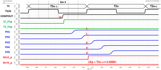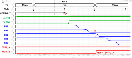 Note that the complete LE time measurement is then composed of two parts, coarse time information given by TSCLK (registered by the original TS logic circuitry) and fine time information given by the new timing circuitry. The higher the number of ‘1’ in the LE_p code, the earlier the LE event occurred during the corresponding TSCLK. Similarly, Figure 22 shows a time diagram of the simulated pixel when detecting a TE event in bin 2 of TSN. In this case, the fine time information of a TTE estimation is taken only from phases two and four, dividing the TS into three equal parts and providing a 4.17 ns accuracy in TTE. In this case, the polarity is complementary, so the more ‘0’ in the TE_p code, the earlier the TE event occurred during the registered TSCLK.
