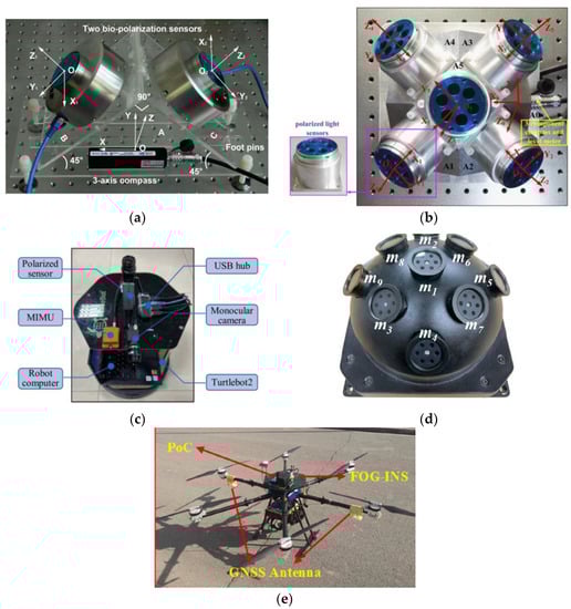 - Yang, J.; Du, T.; Liu, X.; Niu, B.; Guo, L. Method and implementation of a bioinspired polarization-based attitude and heading reference system by integration of polarization compass and inertial sensors. IEEE Trans. Ind. Electron. 2019, 67, 9802–9812. [Google Scholar] [CrossRef]