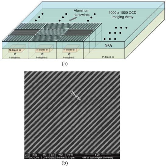 - Gruev, V. Fabrication of a dual-layer aluminum nanowires polarization filter array. Opt. Express 2011, 19, 24361–24369. [Google Scholar] [CrossRef]