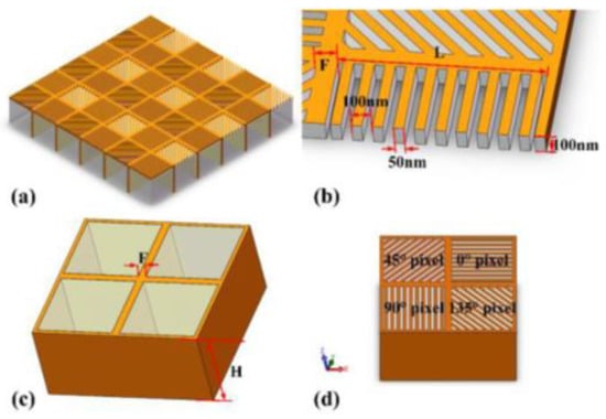 - Nie, A.; Qiu, Z.; Sun, X.; Zhu, J.; Hong, J. Numerical study of a high-extinction-ratio micro-polarizer array with a metal grid substrate. Appl. Opt. 2022, 61, 9795–9800. [Google Scholar] [CrossRef]