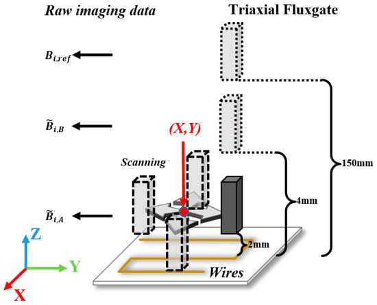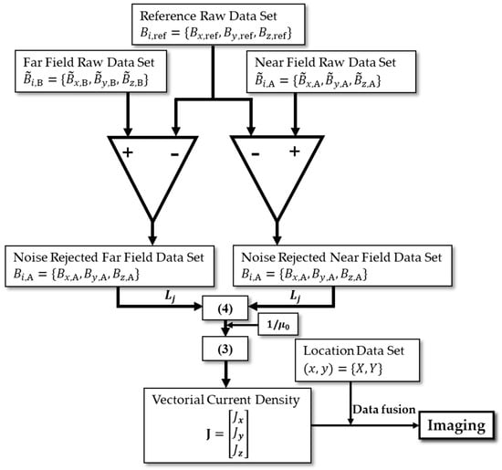 Through the data measuring process shown in Figure 2, we can get a near-field raw dataset, far-field raw dataset, and reference dataset. Figure 3 illustrates the data flow and processing diagram for a vectorial current density imaging method based on the magnetic gradient tensor. First, a struct buffer is applied to store background noise as a reference raw dataset. Second, far-field and near-field tri-axial magnetic flux density datasets are differenced with respect to the reference raw dataset, respectively, to give a noise-rejected far-field and near-field dataset. Third, the second-order differencing is conducted with respect to baselines () to offer a magnetic field gradient dataset. Then, the VCD dataset can be attained based on Equation (3). Finally, by spatially fusing the VCD dataset and location dataset point by point, the vectorial image data of current density are precepted and recorded in an RGB format, where R, G, and B quantitively represent the x, y, and z components of CD. It is practically necessary to mention that each component, as well as the vector strength, can be visualized through a pseudo-color image (e.g., rainbow or traffic cloud picture) with a combination of arrows.