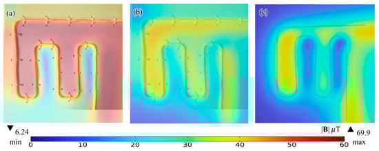 Figure 7 shows the raw near-field, noise-rejected near-field, and numerical magnetic flux density |B| images @ z = 2 mm. The magnetic fields are generated by a DC-5A excited snake shape conductor to represent most DUTs without losing its generosity. We see from Figure 7a that the vector superposition of magnetic fields from DUTs and background magnetic fields are measured to give a relatively high magnetic flux density |B| up to 69.9 μT. Figure 7b,c shows that the maximum magnetic flux density |B| @ z = 2 mm is evaluated to be 41.7 μT, 41.7 μT, and 42.1 μT from Biot–Savart’s solution, numerical simulation and experimentally noise-rejected data, respectively. The results indicate that a highly coherent magnetic field results with a relative error less than 1% can be obtained using a differencing technique with respect to the reference raw dataset based on Equation (5).