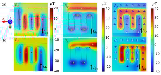 Figure 8a,b shows the x, y, and z components of experimentally noise-rejected near-field data and simulated near-field data in Figure 7b,c correspondingly. Following the positive directions of the imbedded Cartesian coordinate, the feeding DC current from the bottom end of DUT results in obvious above y-guided wire, above x-guided wire, and for all wires are governed by famous ‘right-hand rule’. In comparison with magnetic flux density |B| in Figure 7, the components of B intuitively reflect the directions of CD, however, cannot directly offer current flow directions, especially when a non-orthogonal condition occurs between wire directions and B directions. Benefiting from excellent noise rejection performance endowed using a differencing technique, highly coherent results are obtained between experiment and simulation results, as shown in Figure 8a,b, respectively. It can be also found that the image can roughly indicate the wire contours through its cross-zero isogram. This may be the fundamental principle of traditional Fourier Transform back-evolution method for MCI [2]; however, it is limited in providing the magnitude of CD only.