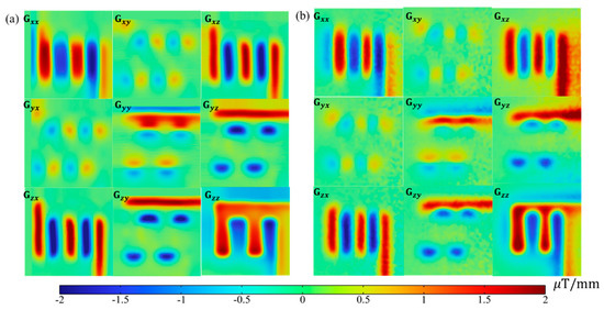 Figure 9a,b shows the full tensor of magnetic field gradient images of experiments and simulation results, respectively. As the most critical intermediate variable, the full magnetic tensor images are derived from measurement results in Figure 8 according to Equation (4). An intuitive impression of large zero areas (colored green in the rainbow bar) leaps to the eyes from the tensor images. This can be attributed to the effects of second-order operations, which has exempted magnetic features induced by non-local CD. Moreover, both experiment and simulation results exhibited a high coherence and strictly symmetric pattern (), which are intrinsic properties of the magnetic tensor. Such property can be practically used as data check criteria. It is also interesting to find that the non-zero value of or appears on the corner. Further examination indicates the right-hand rotation CD results in positive , and vice versa. Such a discovery is not applicable to and because the scanning is conducted parallel to the x–y plane.