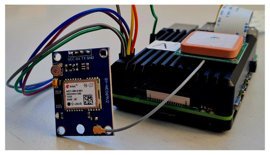 More in detail, the U-blox mini GPS module NEO-6M is a receiver that uses single-point positioning with C/A Code of L1 frequency from the GPS constellation and receives augmented data from satellite-based augmentation systems. In standard scenarios, the single-point positioning technique with single L1 frequency and civilian code has a typical horizontal position error of 13 m at a 95% probability level. Satellite-based augmentation systems (SBAS) can reduce errors and improve data integrity, availability, and continuity. The GPS module’s update rate was 1 Hz. The Python library GPSD [50] allows the acquisition of PVT data on the Raspbian environment through the NMEA protocol. The obtained GPS data includes geographic coordinates, geometric height, UTC time, and velocity.