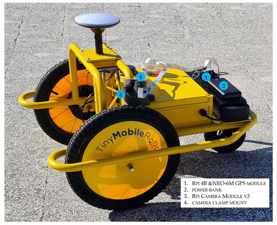 The hardware platform was on the small autonomous carrier (Figure 5) whose cost is not herein disclosed due to agreements signed by the InfraROB partners. The Rpi 4B and its power supply (a power bank) have been fixed in the rear part of the robot. The GPS antenna was in the upper part of the single-board computer case. A camera clamp mounts the camera on the robot chassis, and a sponge material attenuates the vibrations transmitted to the module. Preliminary test shootings returned the best position of the Rpi Camera Module v3 about height (1 m from the road surface) and view angle (45° from the vertical).