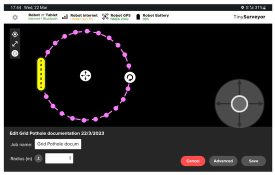 The robot has a control app that provides a custom template for the potholes mapping task. As shown in Figure 6, considering the centre of the pothole as the centre of a circle, the robot can follow a circular path all around the pothole by defining the Radius value as input. Several circles with different radii in the range of 1.0–1.4 m around the pothole need to take enough photos for a complete and detailed pothole 3D reconstruction.