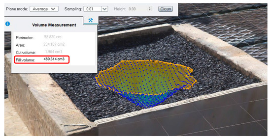 The water volume at which water leaked out of the pothole was 485 mL: it confirmed that the proposed methodology is effective as the water volume returned by the software is very close (a relative error of 1%).
